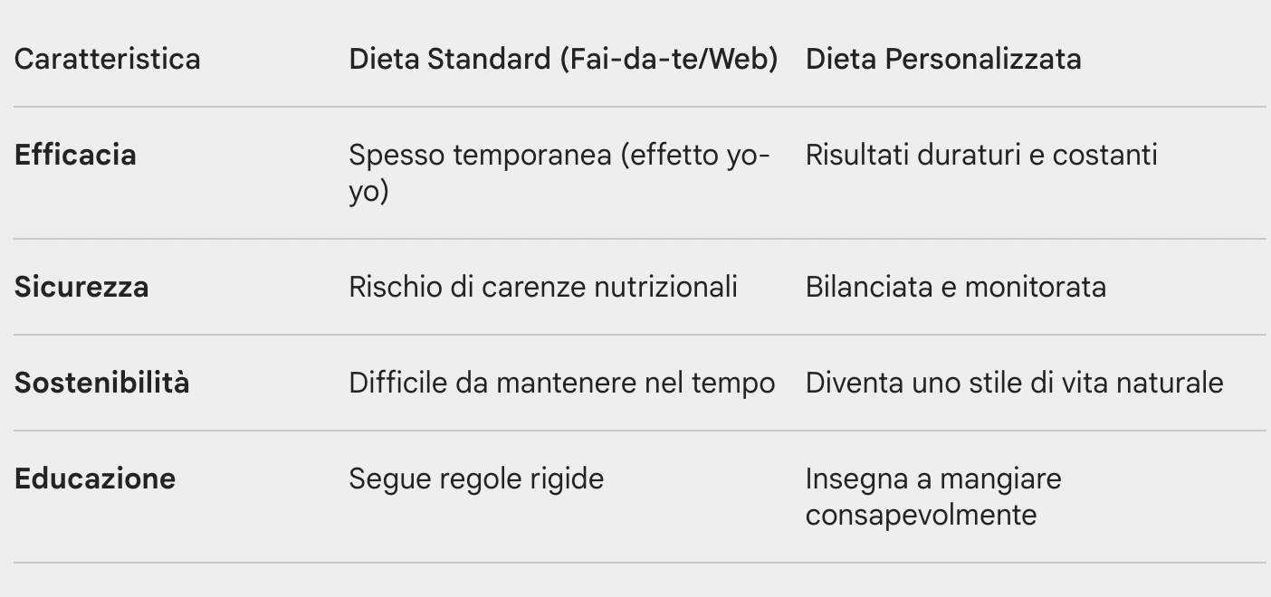 A differenza di un regime alimentare generico, una dieta personalizzata è un piano nutrizionale "cucito su misura" per l'individuo. Non si limita al conteggio delle calorie, ma analizza l'interazione tra cibo, metabolismo e stile di vita.